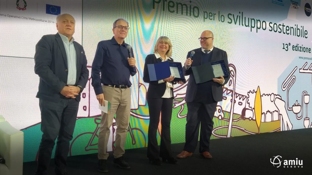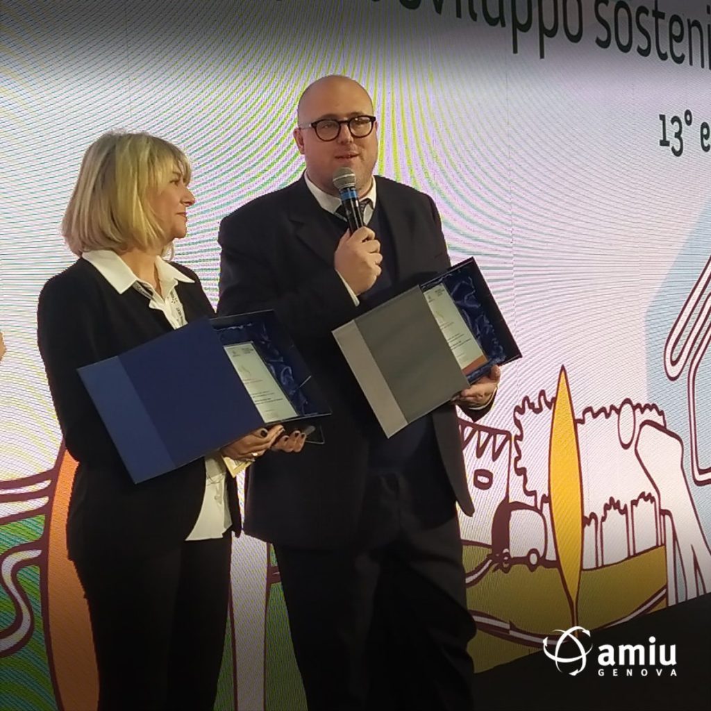 A ritirare il premio il Presidente di AMIU, Giovanni Battista Raggi, insieme alla Sustainability e Resilience Manager Comune di Genova, Stefania Manca, in rappresentanza dell’assessore comunale all’ambiente Matteo Campora.